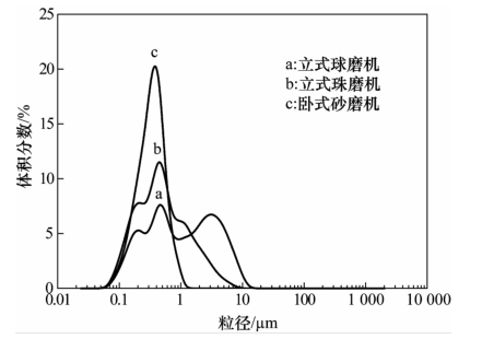 砂磨機按其不同行業使用范圍又被叫做油墨砂磨機涂料砂磨機油漆砂磨機陶瓷砂磨機碳納米管砂磨機等,但按其形式主要分為立式砂磨機臥式砂磨機兩種,下圖是球磨機和立式砂磨機和臥式砂磨機在研磨同種物料下所呈現的粒徑分布圖。